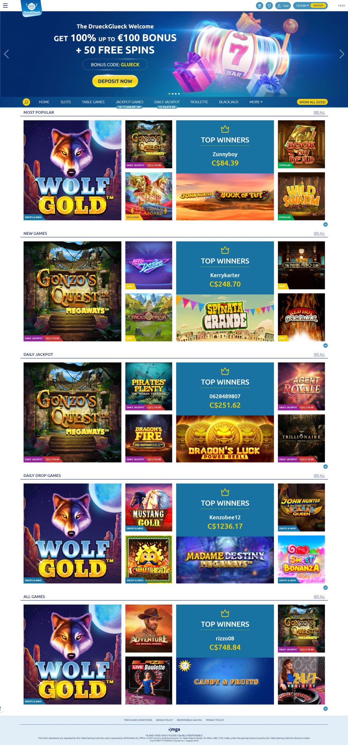 DreuckGlueck Casino ist ein riesiges, plattformübergreifendes Online-Casino, das Spiele für Spieler zu Hause und unterwegs bietet. Die Website richtet sich an europäische Spieler und wird von WMS, NextGen PC Gaming, NetEnt, Barcrest Gaming und vielen weiteren Anbietern betrieben. Zusätzlich bietet sie zwei Live-Casinos von Evolution PC Gaming. Das Casino ist sofort spielbar und verfügt über eine benutzerfreundliche Oberfläche im Stil niedlicher Monster. Die Website von DrueckGlueck Casino ist in Schleswig-Holstein, Malta, Großbritannien, Schweden und Dänemark lizenziert.